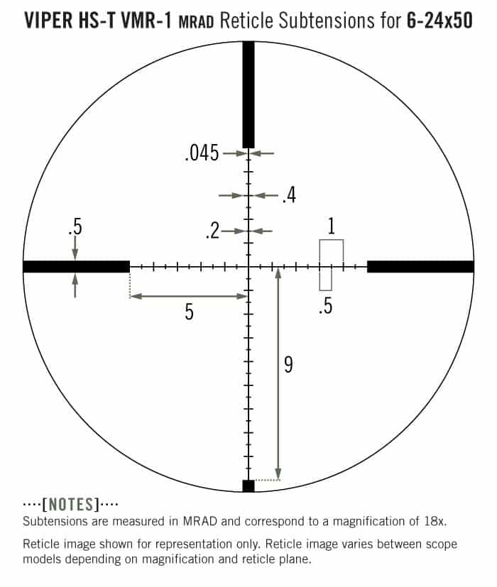 Subtension detail for the Viper HST 6-24x50 with VMR-1 MRAD reticle. >