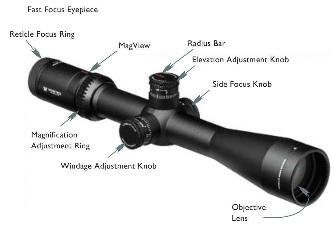 | Side Focus | Adjustment located on riflescope's left side and is easily accessible from shooting position. Provides optimal image focus and parallax removal. |