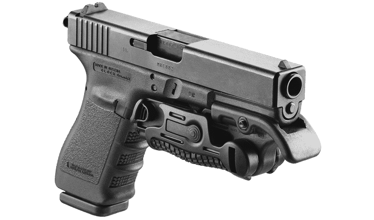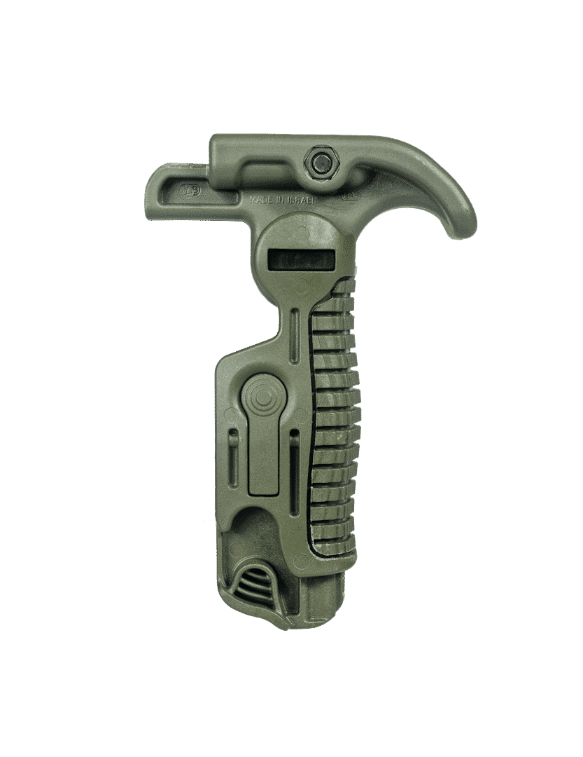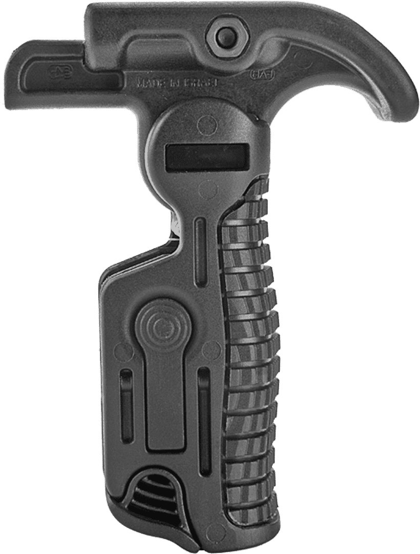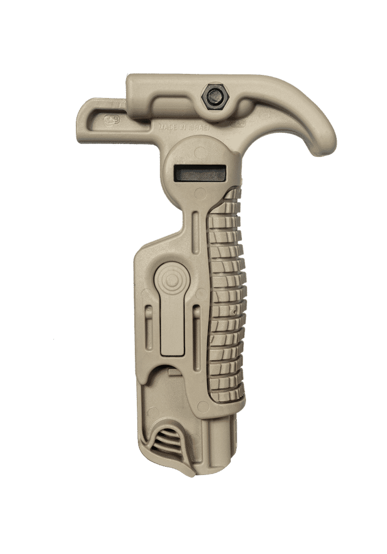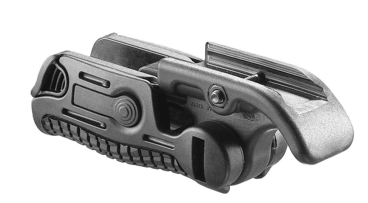 The FGGK Two-Position foregrip transforms from horizontal to vertical by the push of a button, incorporating an adjustable sliding trigger guard enhancing your weapons safety feature and provides a tactical variant to your natural "fighting stance".