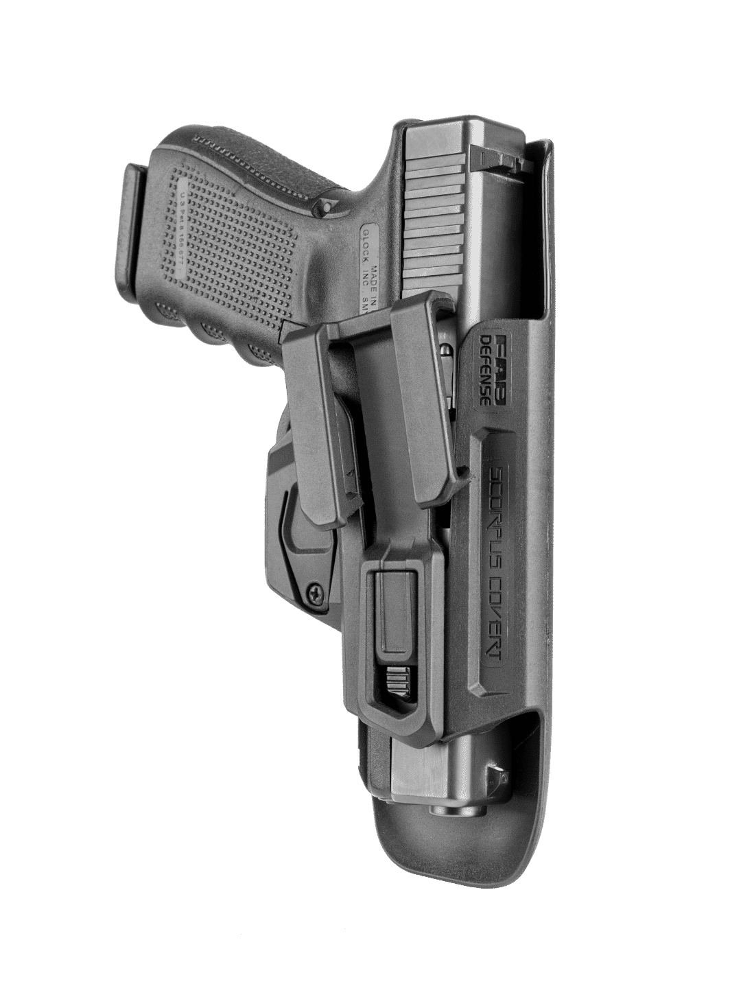 The Scorpus Covert G9 is perfect for concealed carriers who need a reliable, rugged, and comfortable holster to accommodate their mid to full-sized handgun day in and day out. The FAB Defense Scorpus provides a rigid design that can accommodate the challenge of carrying a full-sized firearm. The wide, two-prong belt clip grabs onto belts and supports the weight and size of a large weapon with ease. The backing protects these weapons from the body and reduces the gun?s exposure to sweat.?