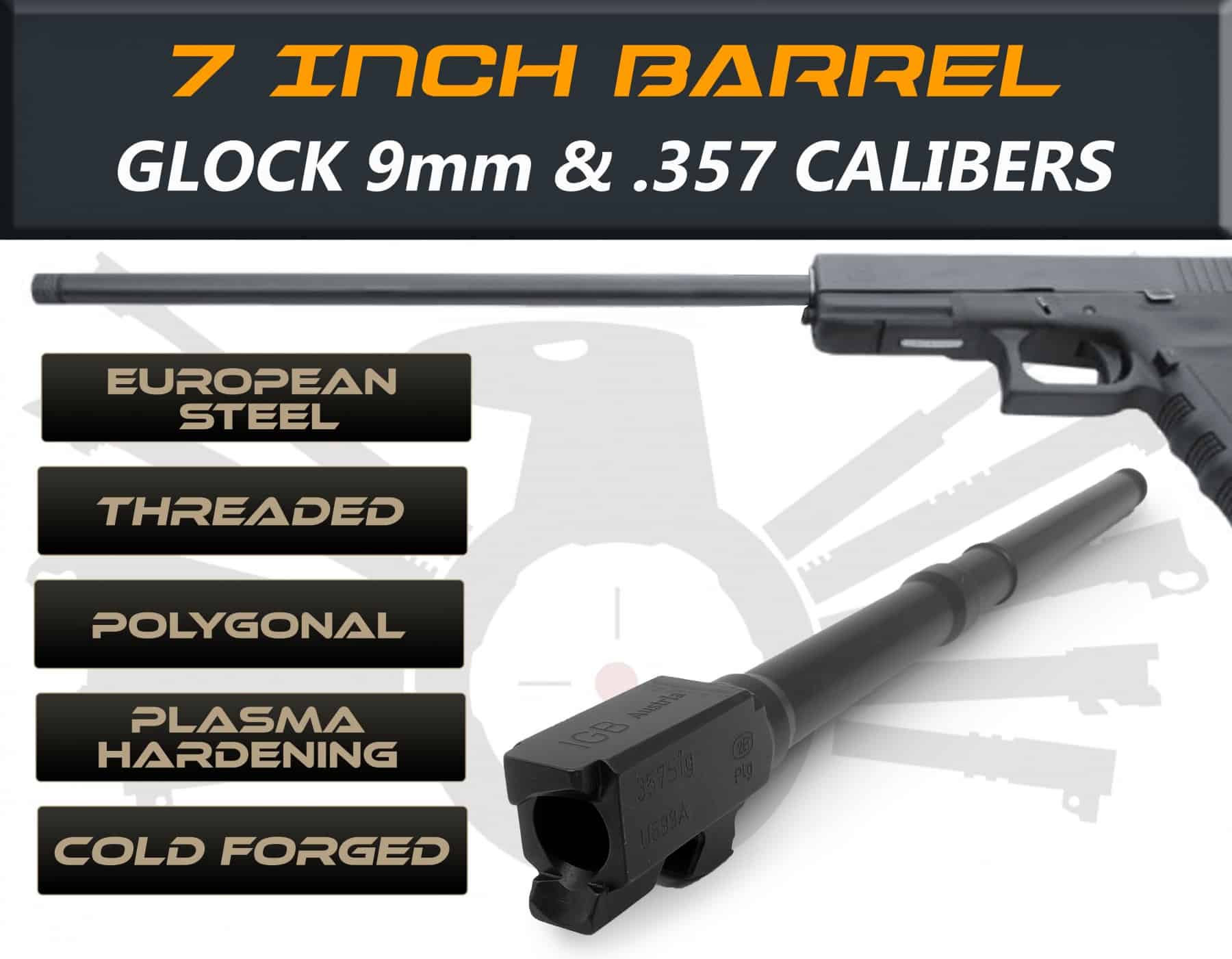 [/vc_column_text][vc_column_text]The Impulse System was developed to eQualityuip pistols, which dispose of a Browning type lockup (i.e. Glock, Colt, CZ?) with barrels up to 42 cm (16") length. Moreover, these units offer for the first time the advantage of using compensators or longer match barrels in combination with target loads.?Abb. Glock 17 with IGB 10" barrel and matching shroud. [/vc_column_text][vc_single_image image="100061" img_size="medium"][/vc_column][vc_column width="1/2"][vc_column_text]