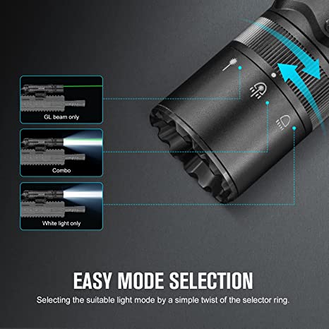 • ?Three Selectable Modes: Switch between white light only, GL beam only, and white light & GL beam combined by twisting the selector ring on the head.