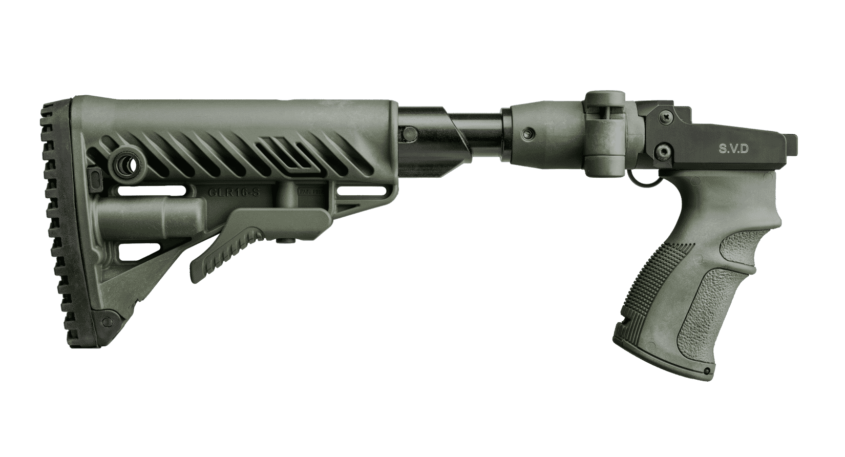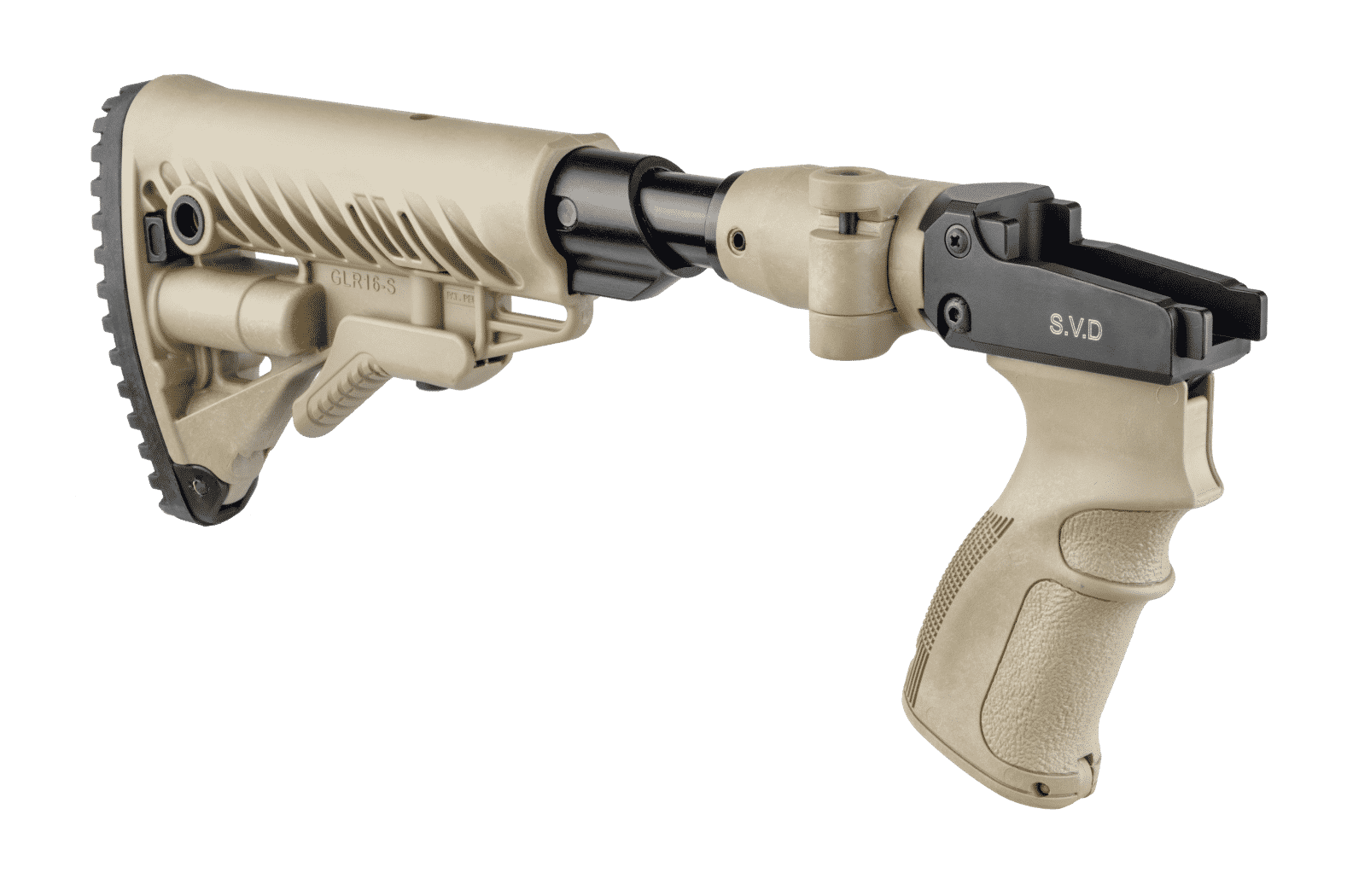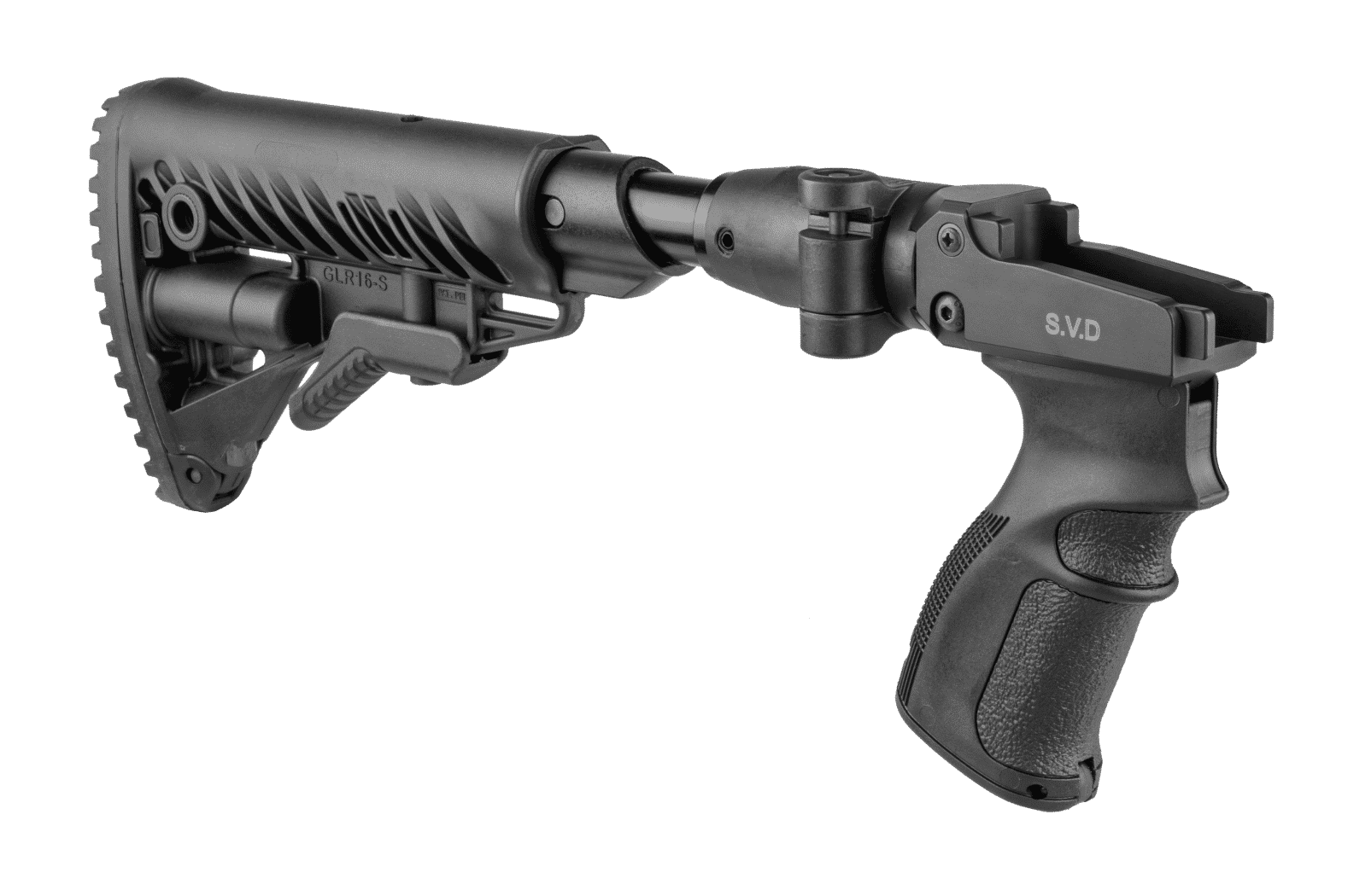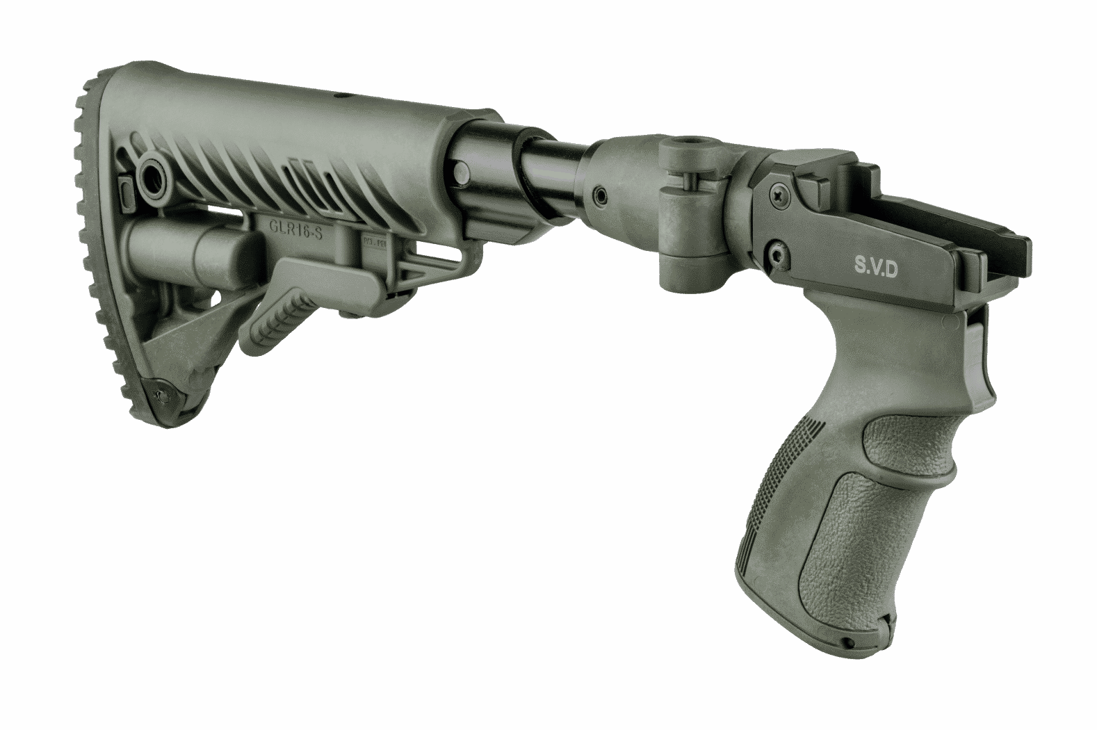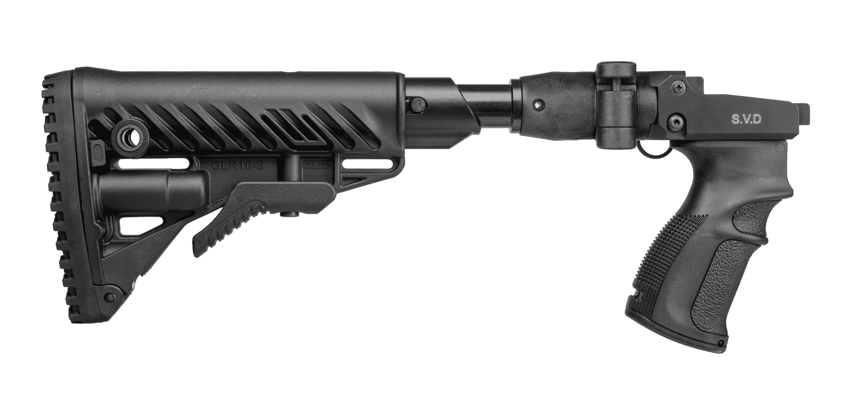 The M4 SVD SB is a combined folding and collapsible buttstock system with shock absorbing mechanism and ergonomic pistol grip made for improved trigger operation, ergonomics, and overall performance of the Dragunov Sniper Rifle (Snayperskaya Vintovka Dragunova).