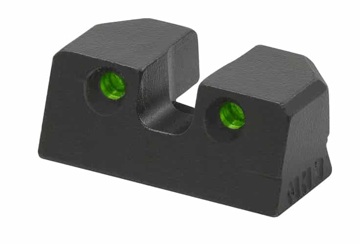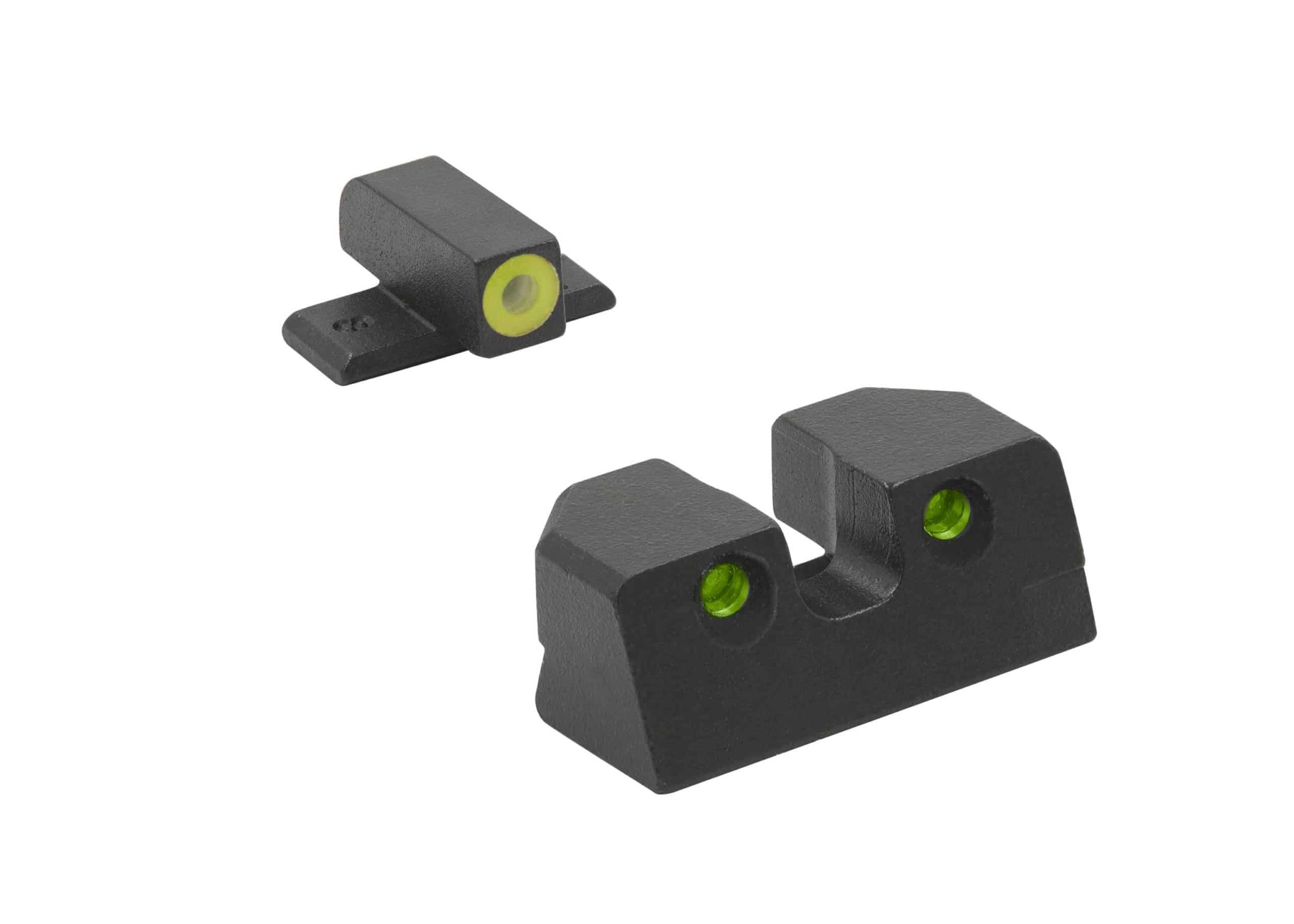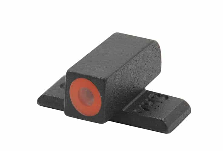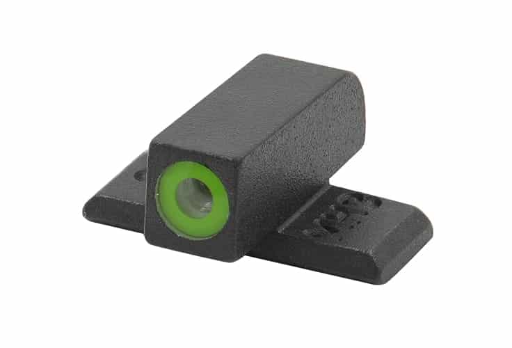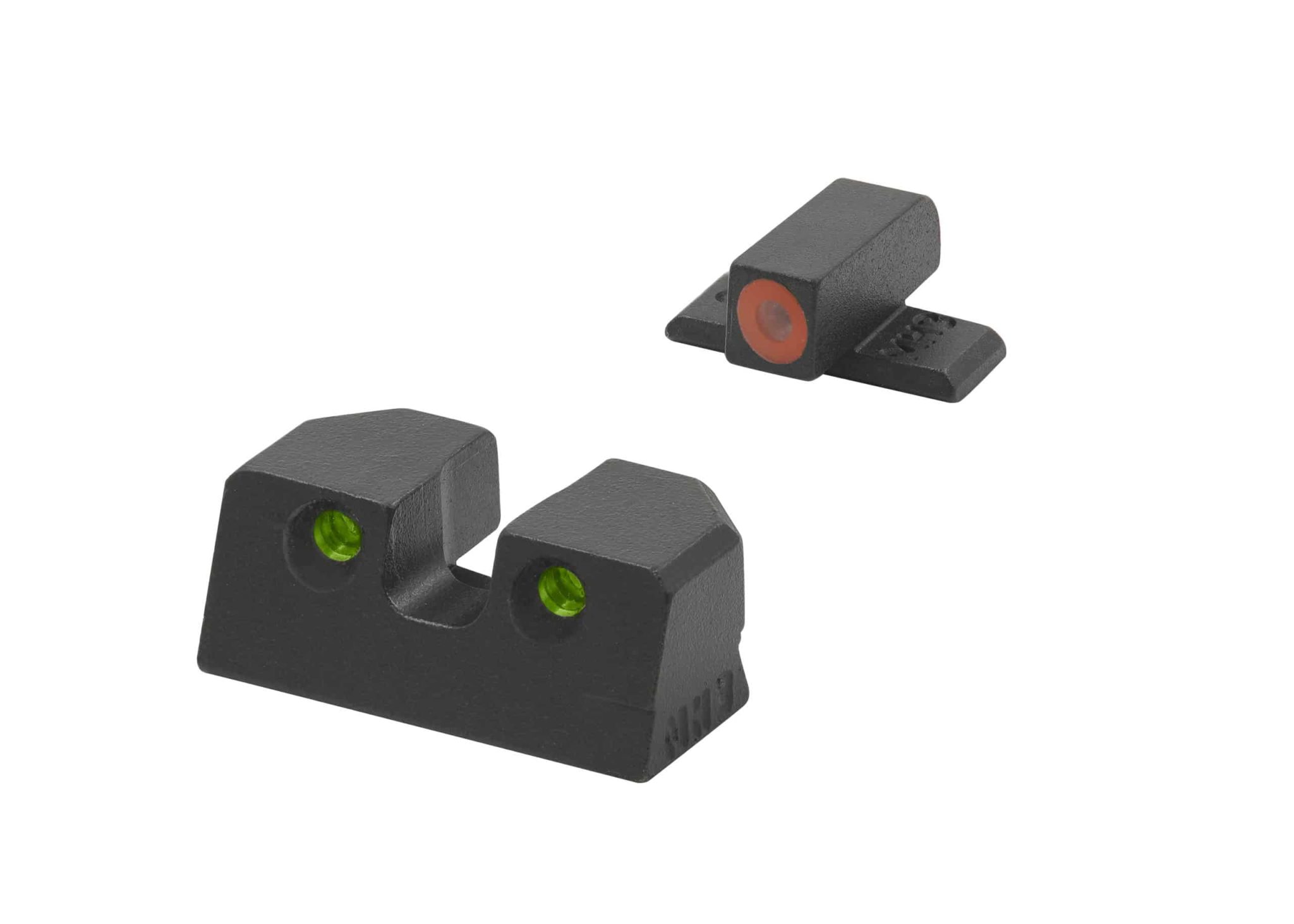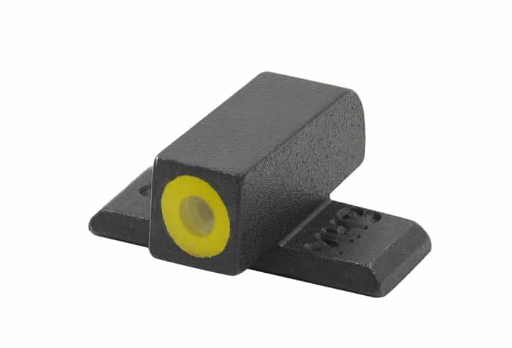 Mepro Hyper-Bright fixed pistol sight features an extremely bright contrasting colored ring front sight. Shooters can select from one of three colors Green, Yellow, or Orangefor the front sight. The tritium is illuminated green to provide low-light and nighttime aiming capabilities. The contrast in colors of the two components helps the shooter focus on the front sight quicker, which is critical in defensive and competitive shooting.