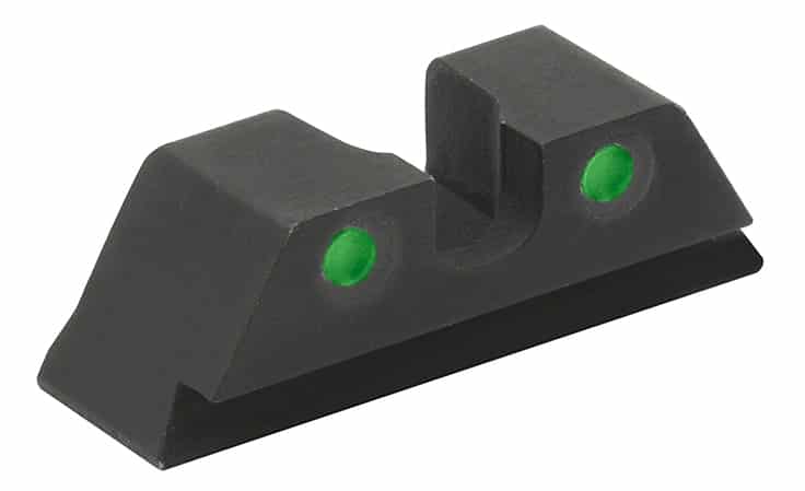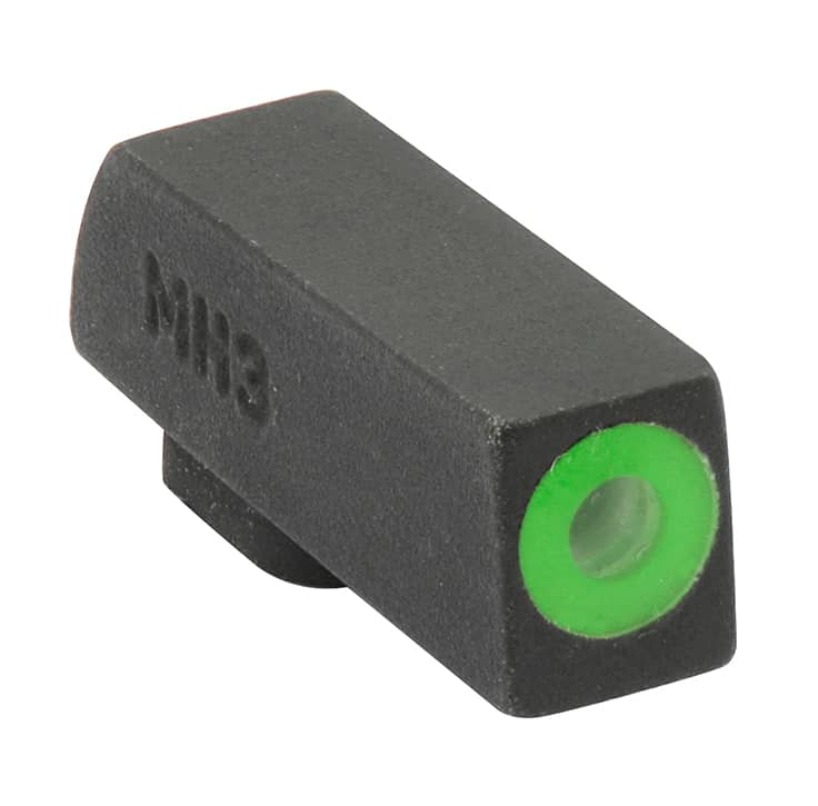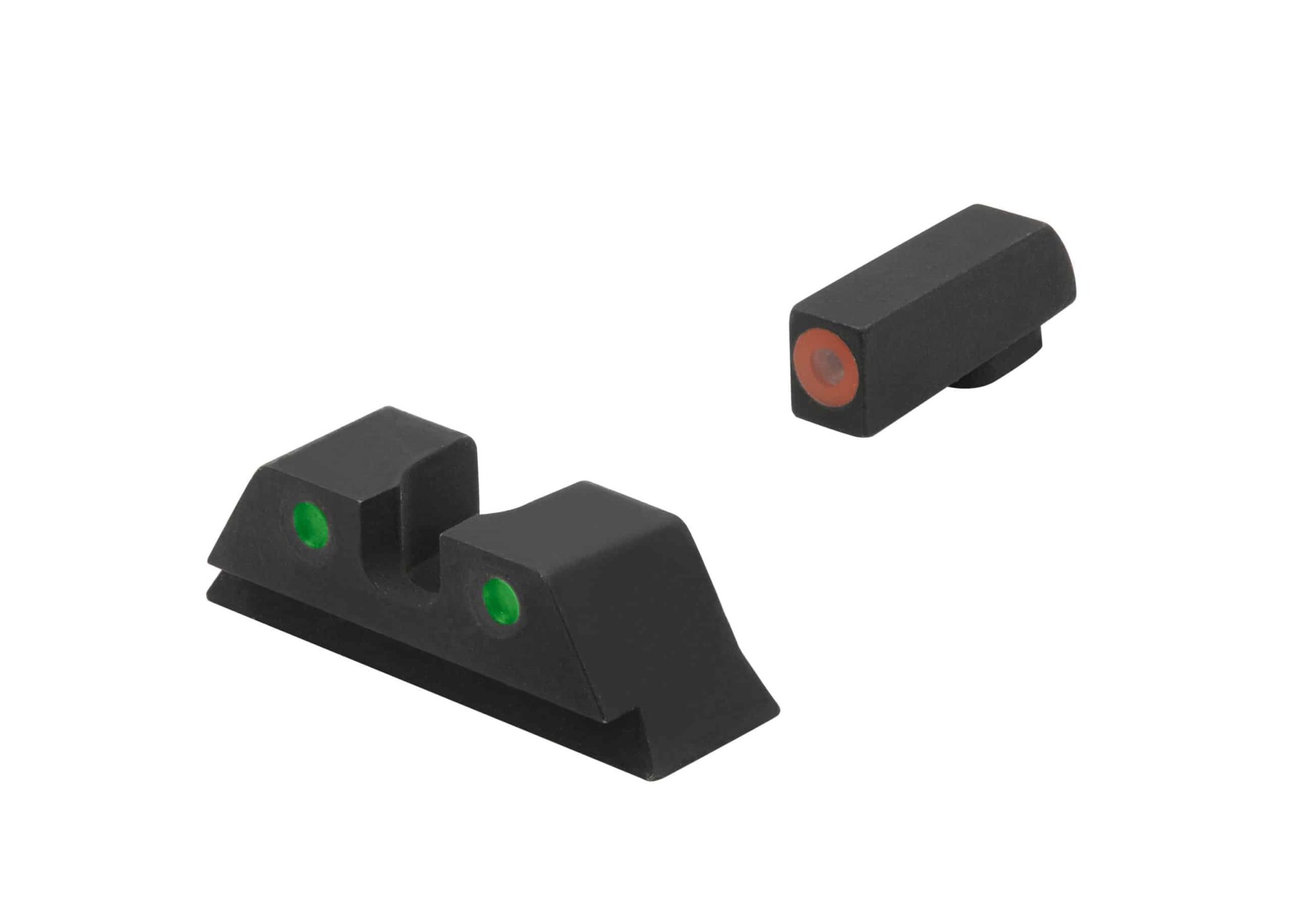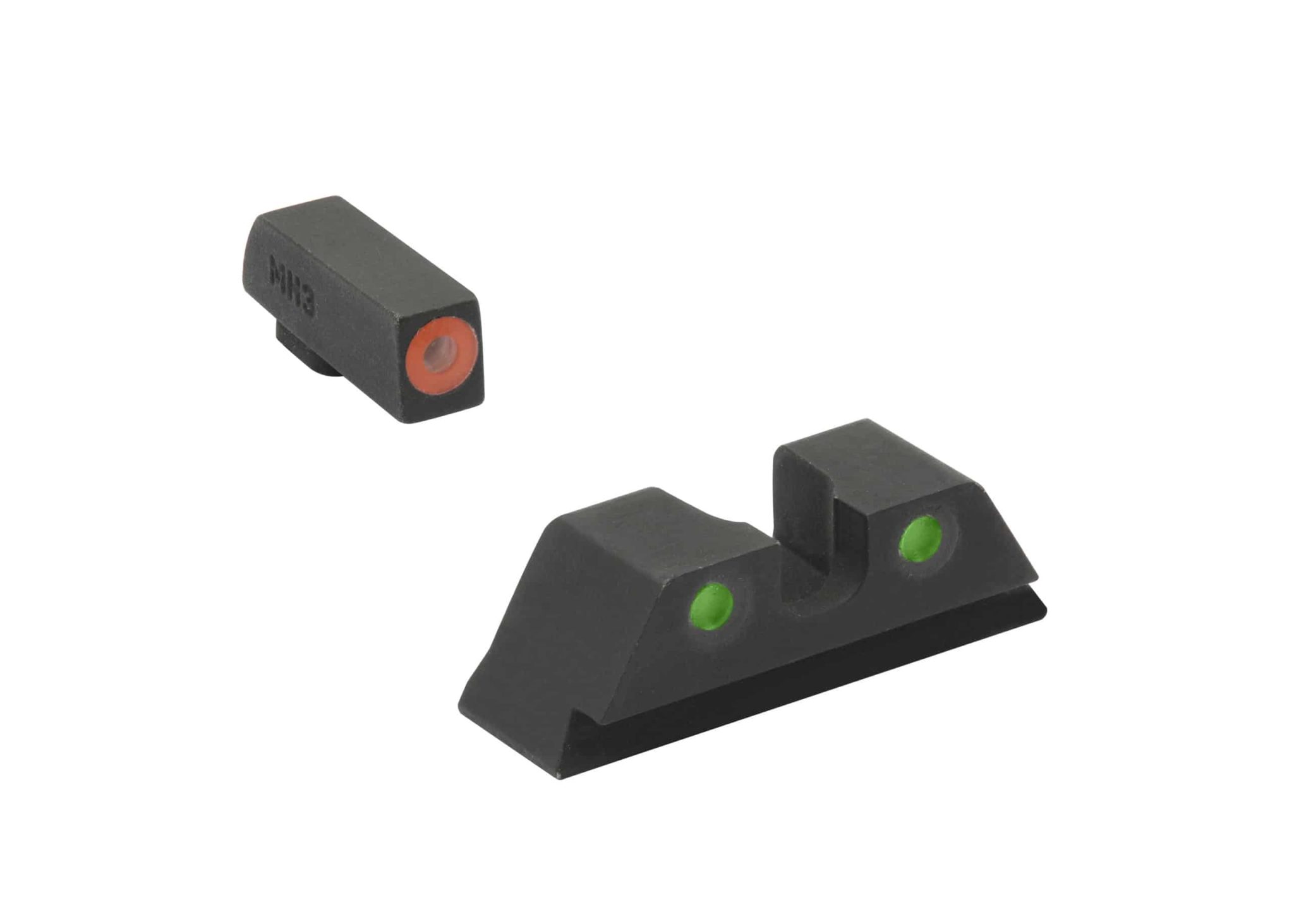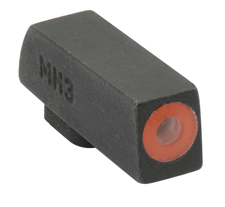 Mepro Hyper-Bright fixed pistol sight features an extremely bright contrasting colored ring front sight. Shooters can select from one of three colors Green, Yellow, or Orangefor the front sight. The tritium is illuminated green to provide low-light and nighttime aiming capabilities. The contrast in colors of the two components helps the shooter focus on the front sight quicker, which is critical in defensive and competitive shooting.