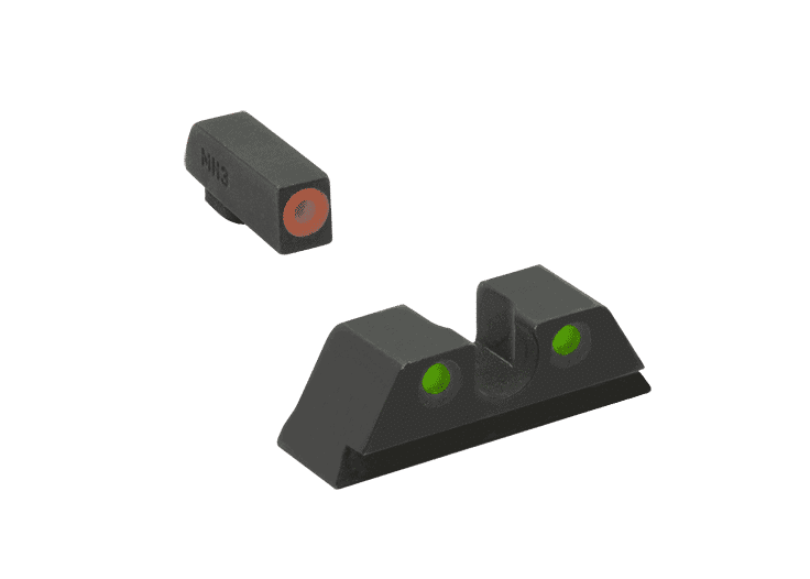 Mepro Hyper-Bright fixed pistol sight features an extremely bright contrasting colored ring front sight. Shooters can select from one of three colors Green, Yellow, or Orangefor the front sight. The tritium is illuminated green to provide low-light and nighttime aiming capabilities. The contrast in colors of the two components helps the shooter focus on the front sight quicker, which is critical in defensive and competitive shooting.