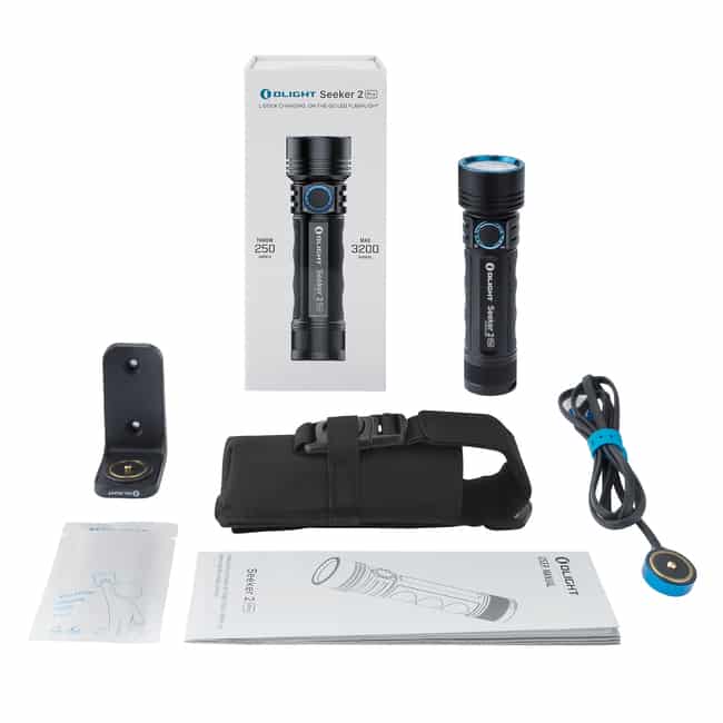 | Unique Characteristics | (1). Compact size with powerful performance: incredibly delivers a maxmum output of 3,200 lumens and a long beam distance of 250 meters, providing you a new flagship-level illumination experience. (2). Convenient L-dock included: can be attached to or fixed (3M tape included) on a wall or table indoors that is close to a power source, providing a dedicated charging location for your Seeker 2 pro. (3). Visual display indicators on both sides of the switch: the four indicators on the right side clearly display the battery level and the four on the left side display the brightness level. (4)Milled finger grooves and dermatoglyphic silicone are used on the surface of the holding position, making it soft and anti-slip. (5). Customized high capacity 21700 lithium rechargeable battery: currently the highest 5000mAh battery in its size for great runtimes. |