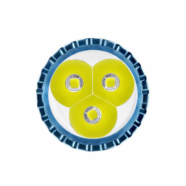 (1) Paired with three highly efficient cool white LEDs, delivering a maximum output of 3,000 lumens and a beam distance of 220 meters.