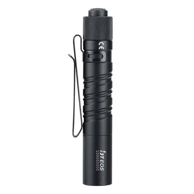 The i3T EOS is a slim tail switch flashlight powered by a single AAA battery with a max output of 180 lumens.
