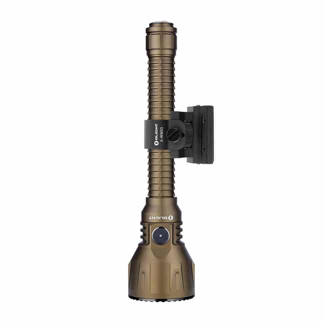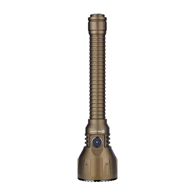 The Javelot Turbo is a dual-switch LED flashlight upgraded from Javelot Pro. Most of the great features of Javelot Pro are still there, including the throw, convenient side switch, integrated replaceable battery pack, power level indicator, and the 63mm bezel diameter. There are some new upgrades. The beam distance has been furthered from 1,080 to 1,300 meters. The two 5000mAh 21700 battery pack replaces the previous two 3500mAh 18650 battery pack. The signature 3-in-1 tail switch has been raised a little, just like that of Odin, to enable a more smooth tactical operation. As a result, now you can charge the product via a normal MCC3 charging cable, or lock it up with a ROD remote pressure switch. For sure, the Javelot Turbo is one of Olight?s best illumination tool for hunting or search and rescue.
