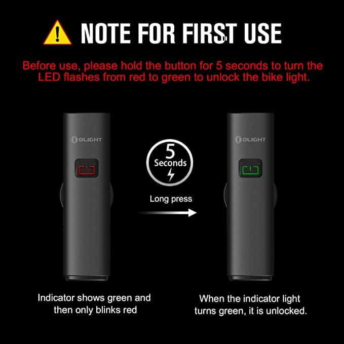 • ?Attention?Before use, please hold the button for 5 Seconds to unlock the bike light. Otherwise the button will flash red and the light will not turn on due to the built-in locking function.