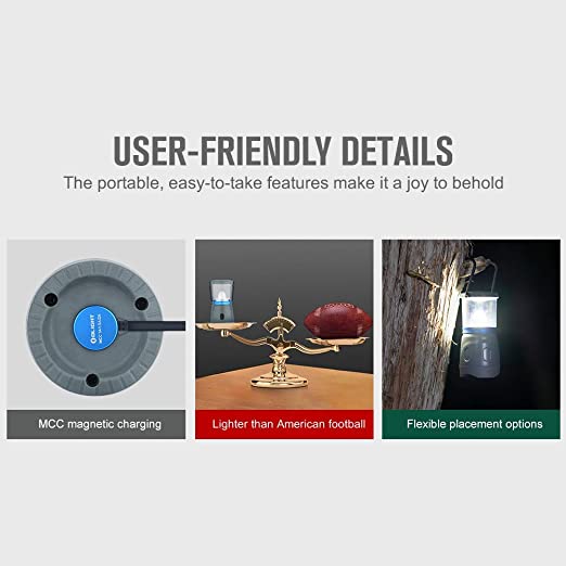 • ?Human-Oriented?Motion-sensitive battery indicator, fading on and off to help locate lantern in the darkness and showing the power level in three colors (Green: Power>70%, Orange: Power is between 30% and 70%; Red: Power<30%).The hanging hook and stable base make carrying, storing and decorating super handy.