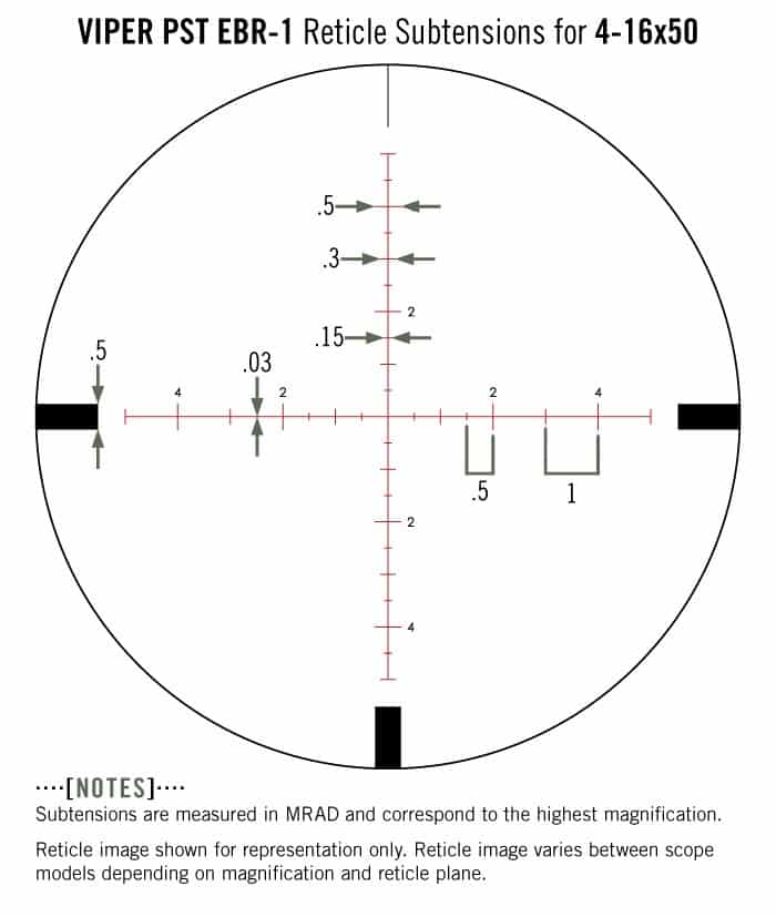 Subtension detail for the Viper PST 4-16x50 riflescope with EBR-1 MRAD reticle. >
