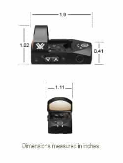 The durable, machined aluminum housing ensures the unit will stand up to whatever you throw at it. High-quality, fully multi-coated lens offers a clean, wide field of view. Our top-load system makes changing the CR 1632 battery a snap and alleviates the need to remove the sight when switching the power source. The power and dot intensity controls are conveniently located on the left side of the unit. Flush 1 MOA windage and elevation adjustments are super sleek and make sighting in a breeze.