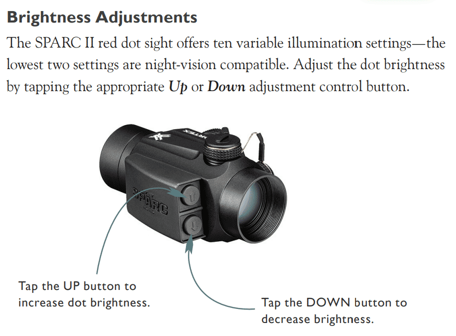 | Adjustable Dot Intensity | Provides ten variable illumination settings?the lowest two settings are night-vision compatible. |