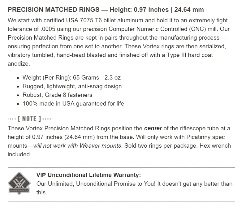 These Vortex Precision Matched Rings position the center of the riflescope tube at a height of 0.97 inches (24.64 mm) from the base. Will only work with Picatinny spec mounts?will not work with Weaver mounts.