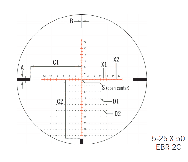 Hash-marked ranging reticle using MOA or MRAD based subtension lines for ranging, holdover, and windage corrections. Letters refer to reticle subtensions listed in chart below.