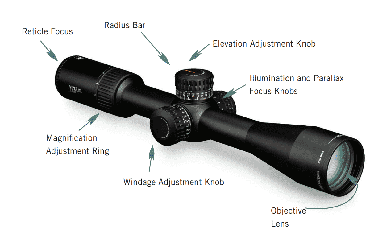 | Built-In Accuracy Features | Matching (MRAD or MOA) turrets and reticles facilitate fast and accurate shooting at extended ranges. The patented fiber optic Radius Bar visually assists tracking turret rotations. US Patent 7,937,879 |